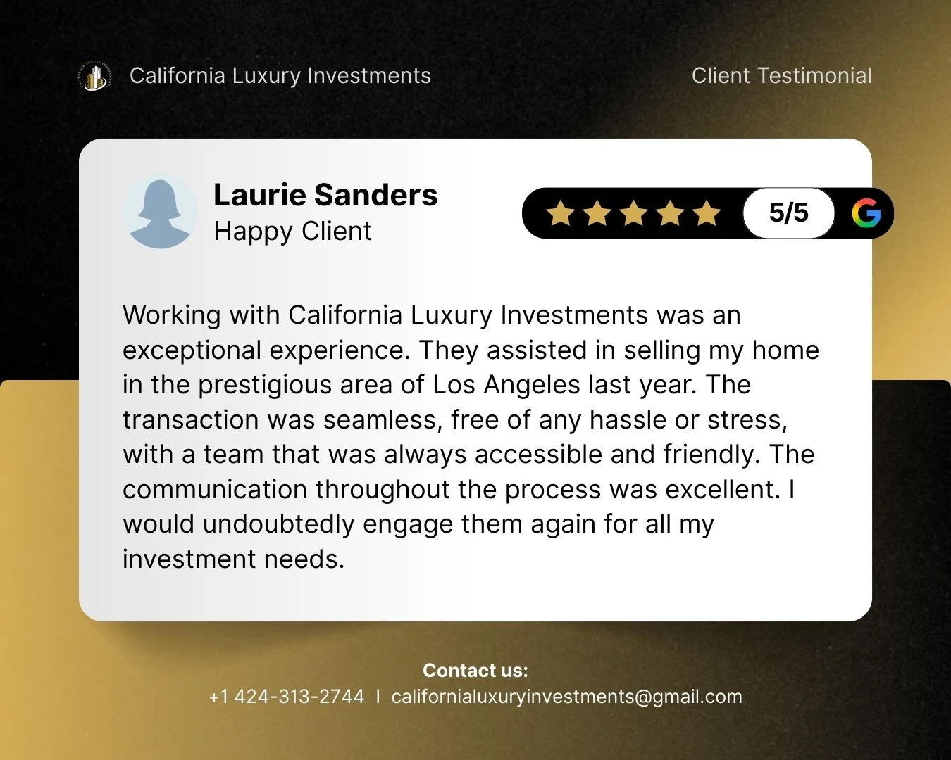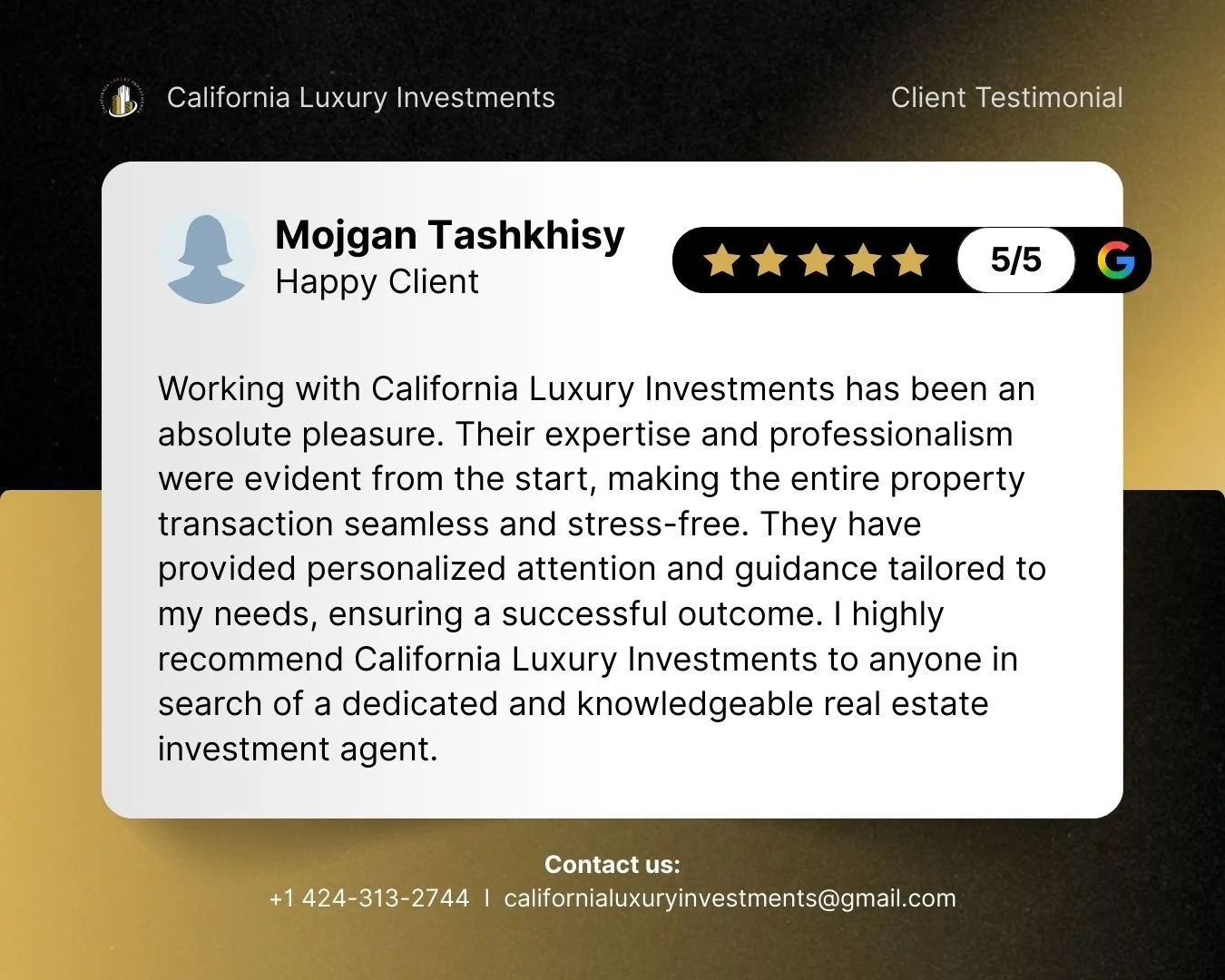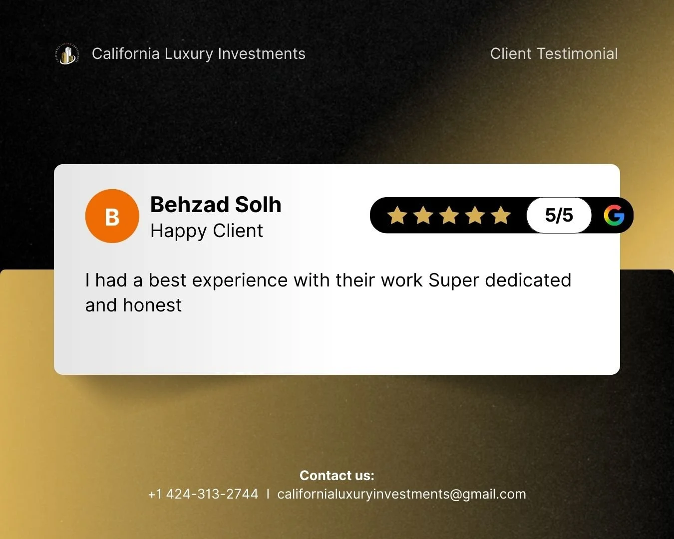 Client Review Aaron Jacobson Read more Laurie Sanders Read more Mojgan Tashkhisy Read more Sharlot Arabshahi Read more Behzad Solh Read more Jason S Read more